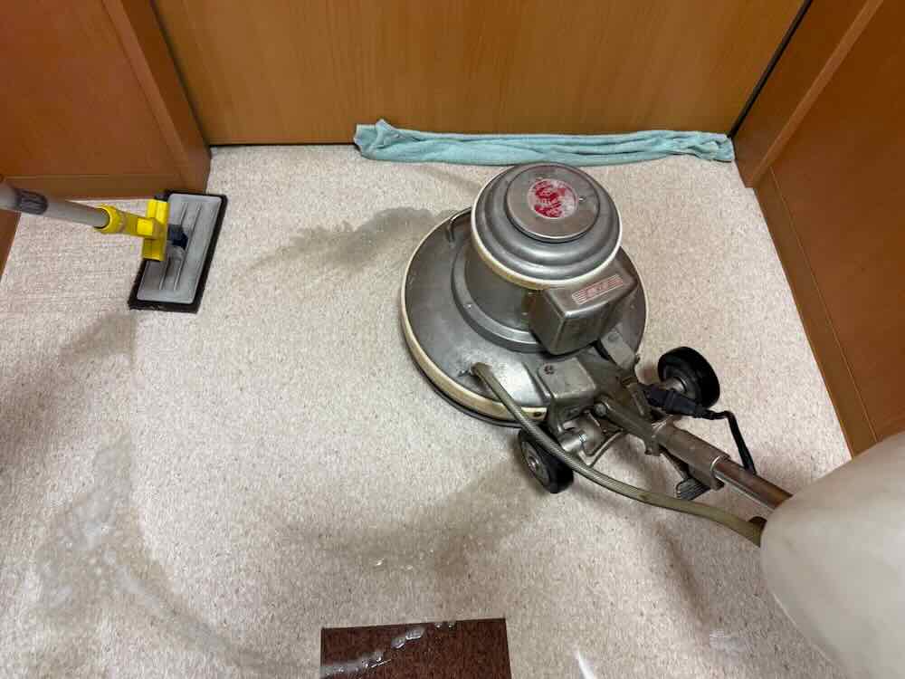 半年に一度のワック洗浄の現場です。ワックスを塗っていない洗浄のみの作業なので、基本的に普段は皆様の清掃作業で綺麗になります。こちらはトイレ清掃を毎週作業させていただいております。トイレ清掃と床清掃、フィルター清掃を担当させて頂いております